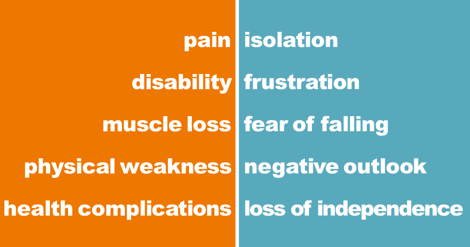 As we get older, we do not, or refuse to, recognize our physical changes. For example, the video below shows what stairs look like to people with aging vision. With older age, our bodies also get worse at maintaining bone and muscle health, balancing and avoiding falls. Unfortunately, this is when falls become more catastrophic, because our landing is less graceful and our bones are weaker and more prone to break.